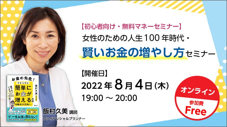 講師には、数々の資産運用・マネーセミナーに登壇し、様々なメディアでも活躍されているファイナンシャル・プランナーの飯村久美氏を迎え、初心者の方向けに「人生100年時代の賢いお金の増やし方」について分かりやすく丁寧に解説していただきます。