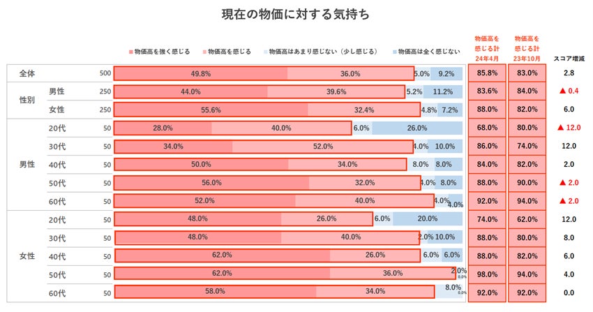 >全体で物価高を感じていると答えた人の割合は85.8%に上り、これは半年前に比べて2.8ポイントの上昇です。家計への圧力は増加の一途をたどっています。