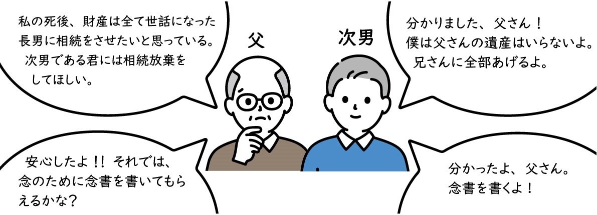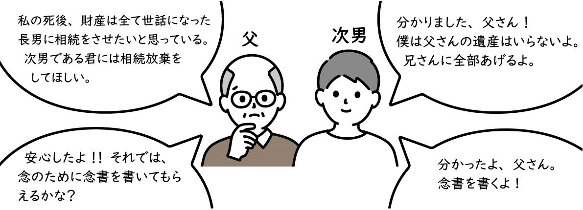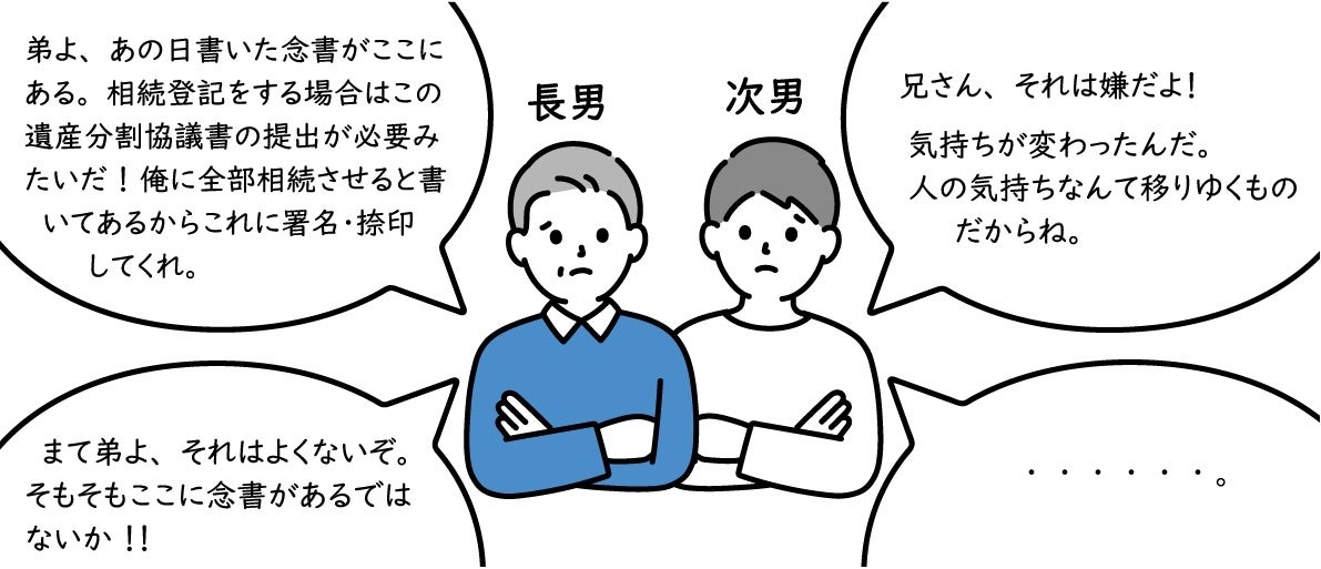 この念書を受け取った父は長男に事の経緯を伝えて引き渡し、これで長男が全ての財産を引き継ぐものと信じていました。念書を受け取った長男は父親に気持ちに応えるように、最期まで父の世話を一身に引受けました。一方、弟は、父親のことは兄に任せ自由きままな生活を送っていました。