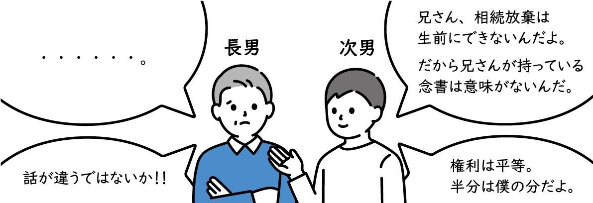 こうなると殆どの場合、当人同士での解決が望めず専門家に相談に行くというパターンになります。弟が主張するように、相続放棄は被相続人の生前にはすることができません。相続放棄の手続きは、被相続人が亡くなって相続が開始してから家庭裁判所に対して申立が必要です。なので、兄はこの念書をもって自分が全て相続するという主張をすることはできません。