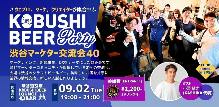 KOBUSHI MARKETING合同会社(東京都渋谷区、代表:井上裕介)が運営する渋谷道玄坂の『KOBUSHI BEER LOUNGE & BAR』では、人と人とを繋ぐユニークな取り組みを行い多くのビジネスチャンスを生み出している。そして今回、株式会社KASHIKAの小澤代表をゲストに迎え、2025年9月2日(火)19:00~デジタルマーケティング、新規事業、DXに携わるビジネスパーソンが集まる交流イベントを開催すると発表した。