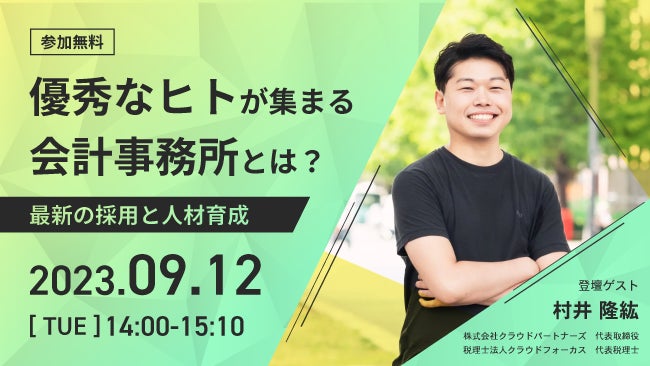 株式会社YKプランニング(本社:山口県防府市、代表取締役:岡本 辰徳、以下YKプランニング)は、株式会社クラウドパートナーズ(本社:東京都千代田区、代表取締役:村井 隆紘、以下クラウドパートナーズ)と共同で、会計事務所・税理士事務所向けに「優秀なヒトが集まる会計事務所とは?~最新の採用と人材育成~」セミナーを2023年9月12日(火)14時よりオンライン開催いたします。