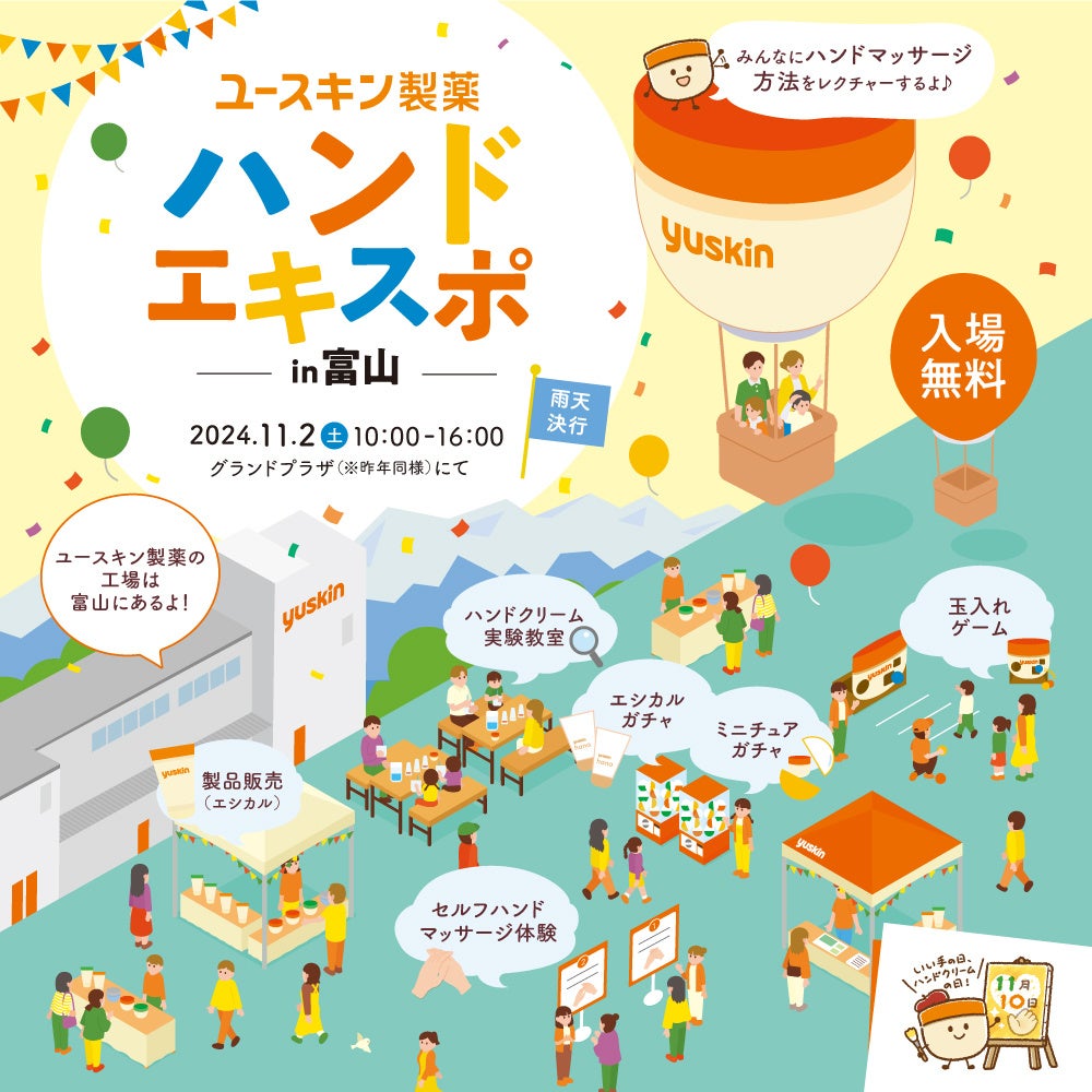 今年は、昨年に引き続き、創業の地でありユースキン製薬の本社がある川崎で、11月24日(日)にイベントを開催いたします。会場では、セルフハンドマッサージ体験や手肌の水分量チェックといったハンドケア体験をはじめ、玉入れゲームや会場限定のミニチュアガチャなど、ユースキン製薬オリジナルコンテンツを用意しています。楽しみながらハンドケアの大切さを体感していただける内容になっていますので、是非ご来場ください。