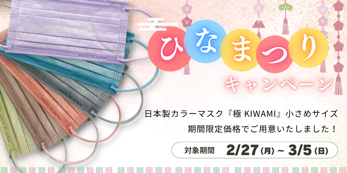 前田工繊では『ひなまつりキャンペーン』を実施し、桃の節句にぴったりなカラーマスク『極 KIWAMI(小さめサイズ・ギフトパッケージ)』を期間限定価格でご提供いたします。