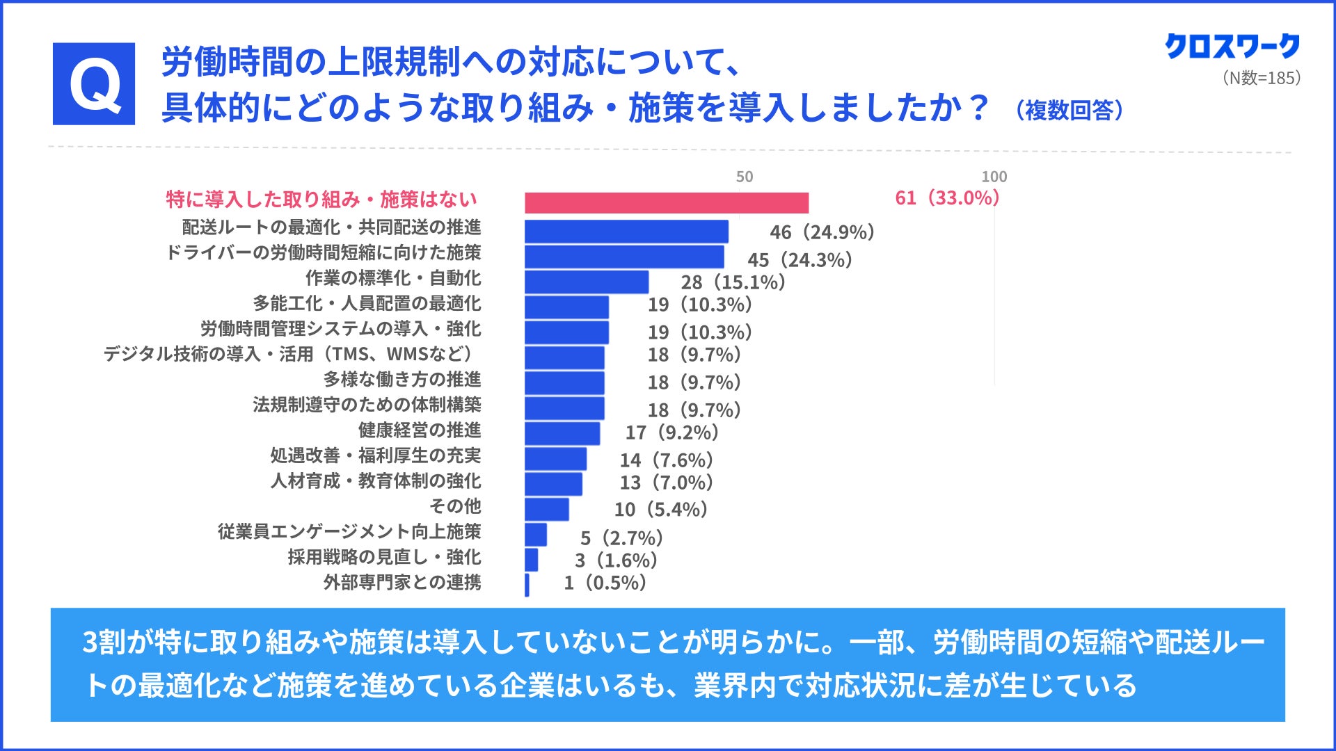 労働時間の上限規制への対応状況を調査したところ、物流事業者の33.0%が『特に取り組みや制度は導入していない』と回答し、対応が遅れている現状が明らかになりました。