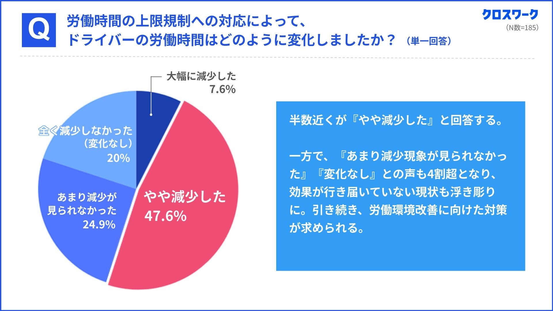 実際に労働時間の上限規制の取り組みによってドライバーの労働時間が変化したかを質問したところ、半数近くの47.6%が『やや減少した』と回答しました。