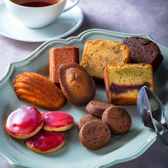 名古屋の人気パティスリーが贈る、上質な素材と丁寧な仕事が光る焼き菓子。フランボワーズの甘酸っぱさが心地いいサブレ、風味豊かなマドレーヌやフィナンシェ。ケークはチェリーやラムレーズンなどのアクセントも絶妙。どれも甘みや香りが実にエレガント。