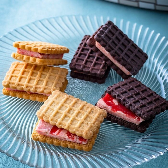ほろほろと崩れる食感のサブレ。ショコラはほろ苦く、ミルクは微かに感じる塩気がいい。挟むのはホワイトチョコベースのストロベリーチョコクリーム。マーブル状にのばした苺ソースによって甘酸っぱさが加わり、サブレのバター感も際立つ。魅惑のハーモニーを味わって。