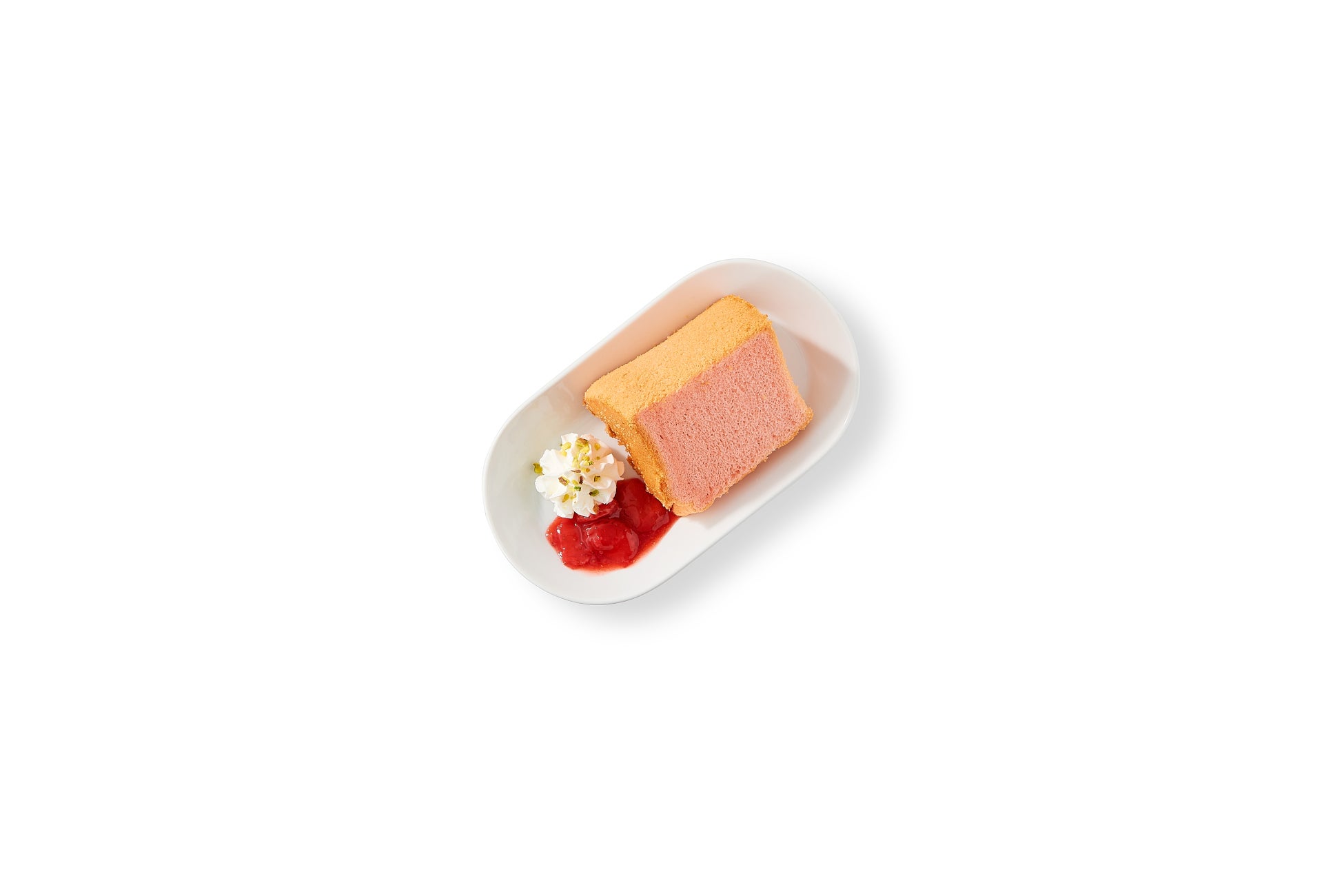いちご風味のふわふわシフォンケーキにストロベリーソースとホイップクリームをトッピング。