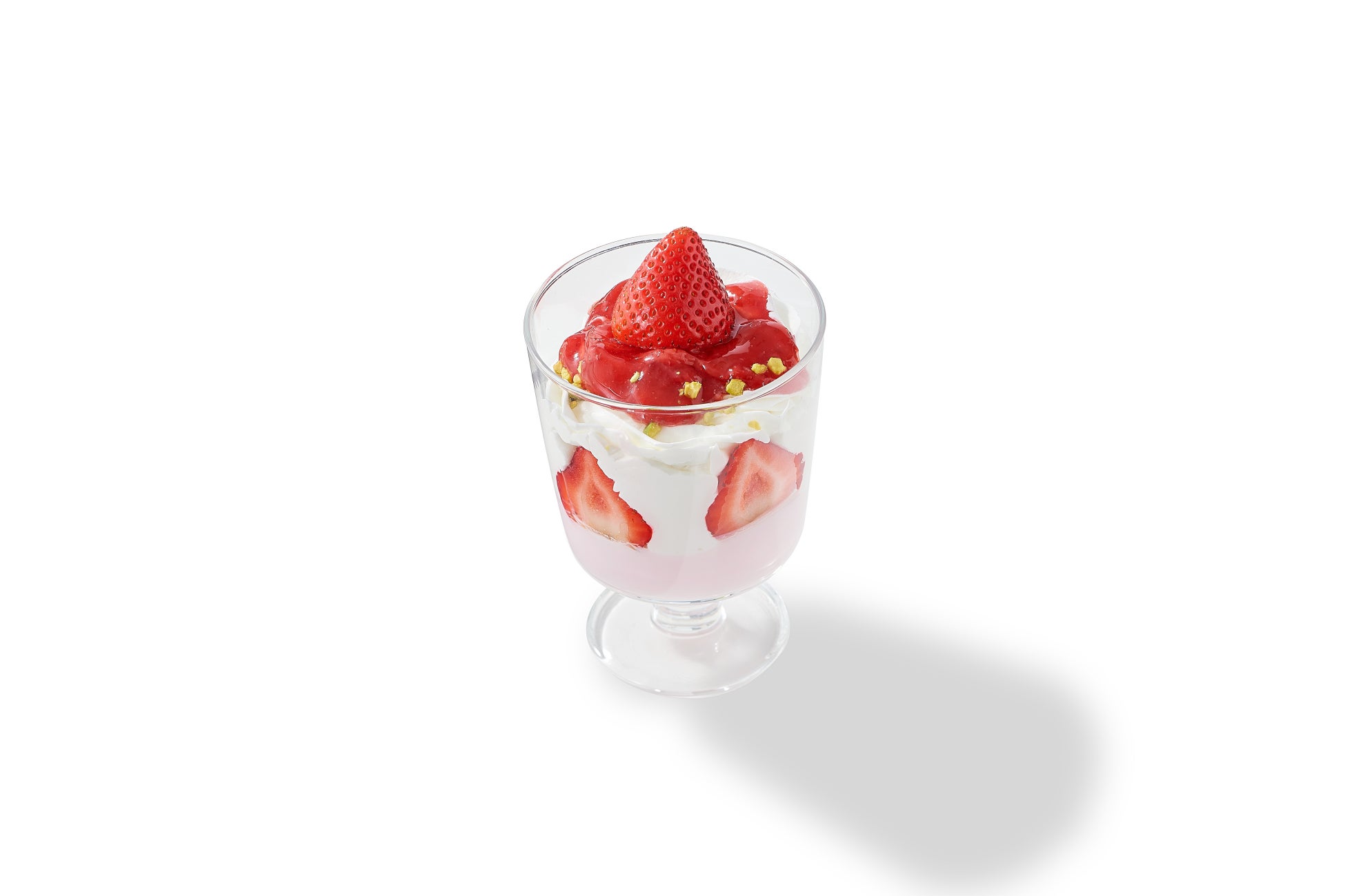 いちごたっぷりのショートケーキをかわいらしくグラスに入れました。ストロベリームースとシフォン、フレッシュないちごを一度に楽しめる豪華なデザート。