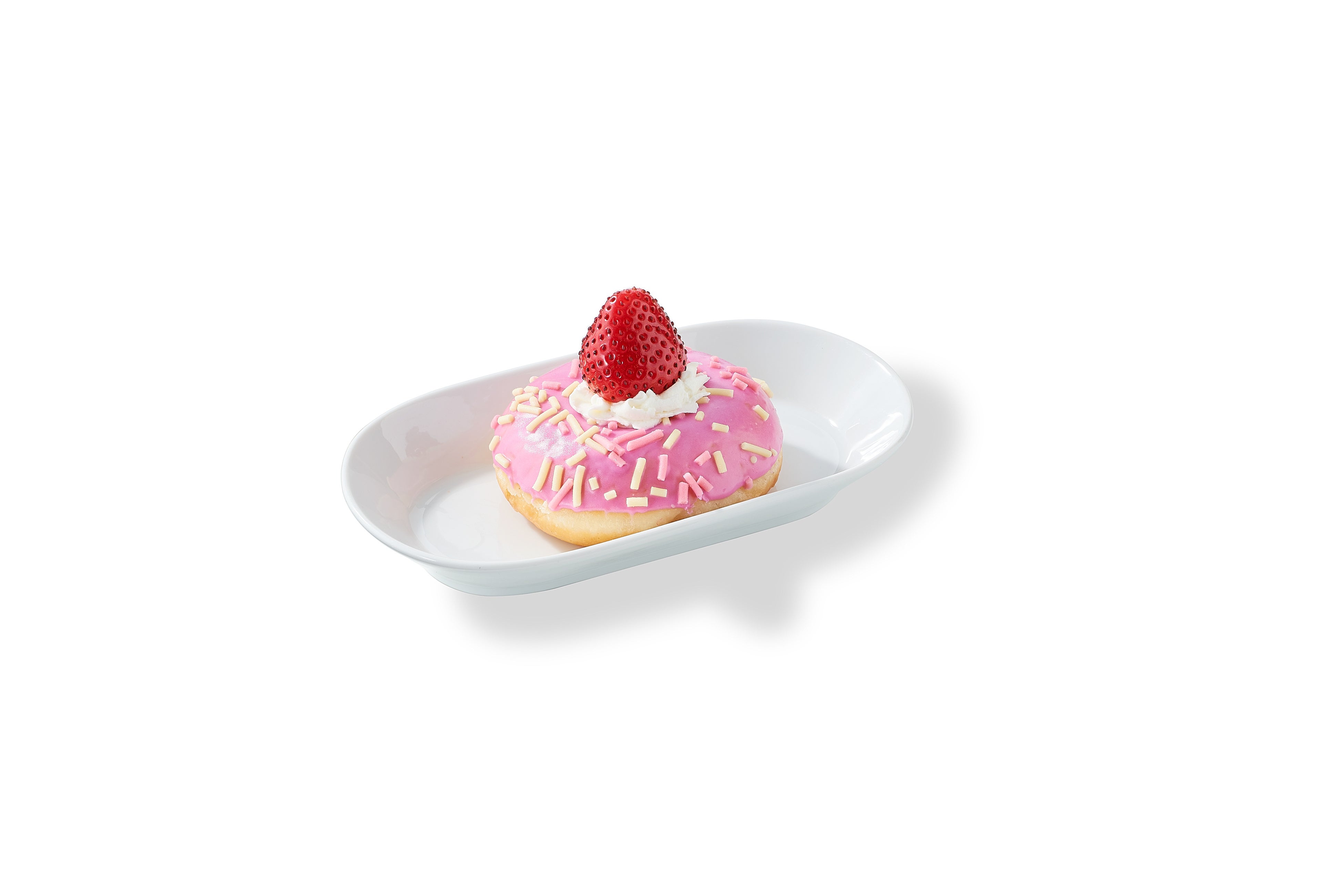 ストロベリードーナツにフレッシュないちごとクリームをトッピングしてケーキ仕立てにしました。