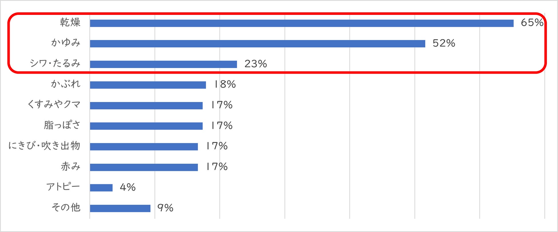 ・具体的には、1位「乾燥」や2位「かゆみ」、3位「シワ・たるみ」といった肌トラブル