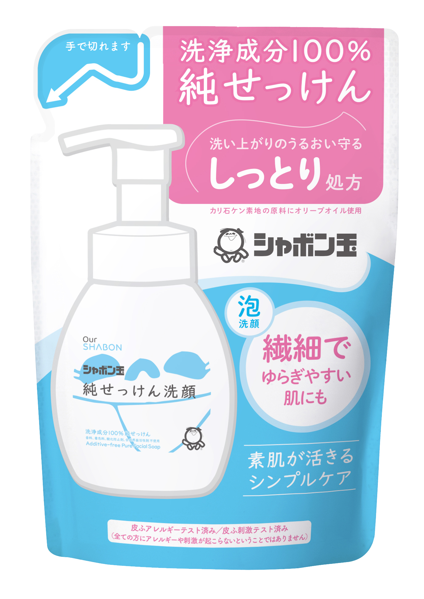 「純せっけん洗顔」(泡タイプ・固形タイプ)は、肌トラブルにつながる可能性のある香料・着色料・酸化防止剤・合成界面活性剤不使用です。洗い上がりのしっとり感はもちろん、洗い心地の良さを追求した「もちピタ泡」を実現し、肌本来の力を引き出す「洗いすぎない・与えすぎないスキンケア」が可能です。