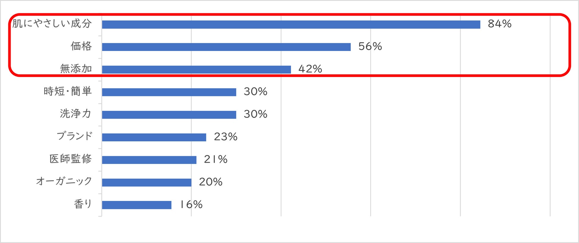 ・スキンケア用品を変える際は、1位「肌にやさしい成分」や2位「価格」、3位「無添加」が重視されている