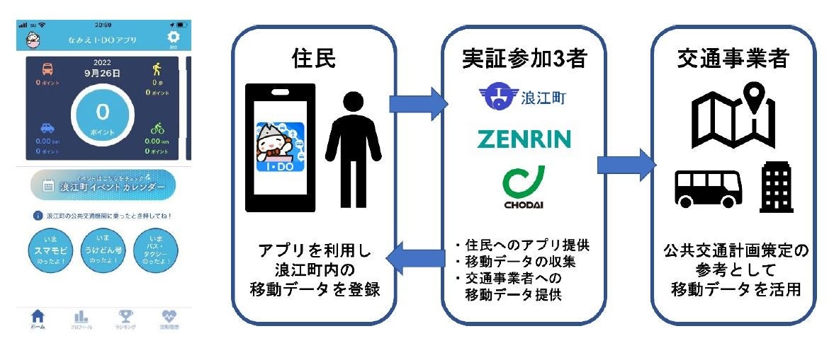 浪江町(福島県双葉郡浪江町、町長:吉田栄光)、株式会社ゼンリン(福岡県北九州市、社長:髙山善司、以下「ゼンリン」)および株式会社長大(東京都中央区、社長: 野本昌弘、以下「長大」)の3者は、浪江町内へのMaaS社会実装及び事業化の実現へ向け、「なみえI・DO(いどう)プロジェクト」の実証実験を実施します。10月7日より提供を開始するスマートフォンアプリ「なみえI・DOアプリ」を活用し、住民の公共交通の利用頻度向上を目指すとともに、アプリで得られる移動データから住民の移動需要および傾向を把握し、誰でも自由に移動できるまちづくりを進めます。