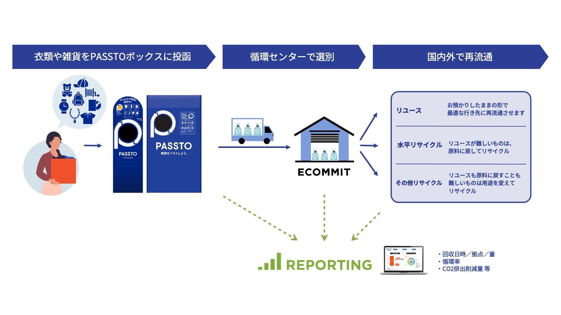 循環型社会に向けた不要品の回収・選別・再流通のインフラを構築する株式会社ECOMMIT(本社: 鹿児島県薩摩川内市、代表取締役CEO:川野 輝之、以下「ECOMMIT」)と、住商アーバン開発株式会社(本社:東京都千代田区、 代表取締役社⻑: 羽鳥 貴弘、以下「住商アーバン開発」)は、地域の廃棄量の削減・資源循環への貢献を目的として、ECOMMITが提供する、不要品の回収・選別・再流通を一気通貫で行う資源循環サービス「PASSTO(パスト)」を、2025年2月1日より、住商アーバン開発の運営する商業施設「晴海トリトン」に導入し、不要になった衣類・雑貨・ホビー用品の回収を開始します。