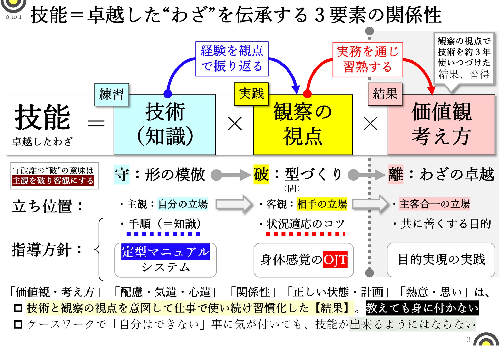 技能伝承の3要素に基づいた体系化:卓越した技能は、「価値観・考え方」「観察力」「技術」の3つの要素が相互に作用し合うことで初めて成立します。このアプローチでは、この3つの要素を組織の現場に応じて段階的に伝承し、最適なタイミングで社員が自発的に技能を習得できるように支援。