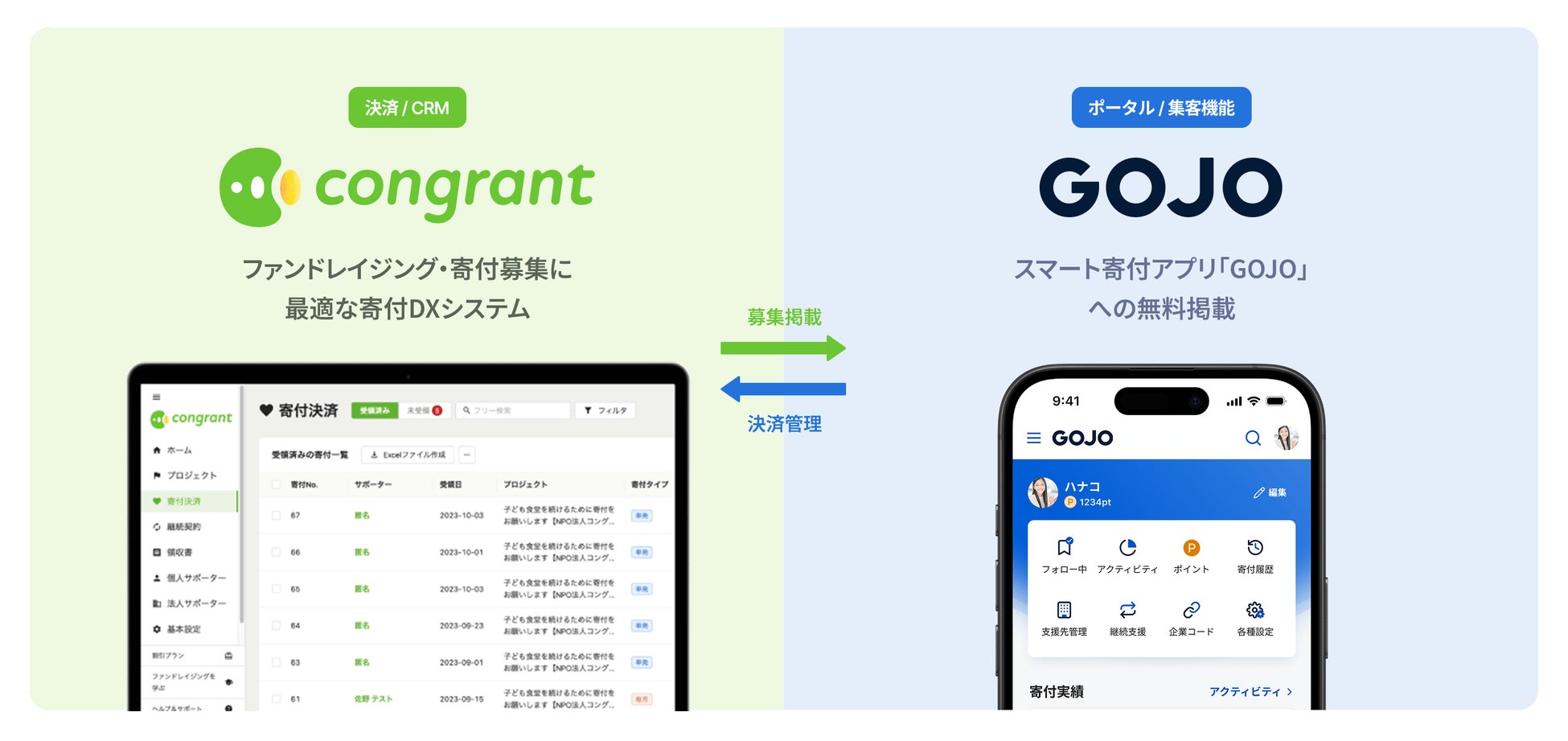 今回のリニューアルは、設立より5年が経過し、提供する機能や対象も大きく広がったことを背景に実施されたものです。特に、2025年5月下旬にリリース予定のスマート寄付アプリ「GOJO」により、コングラントは「寄付決済・CRM機能」に加えて「ポータル・集客機能」を備える新たな寄付基盤へと進化します。