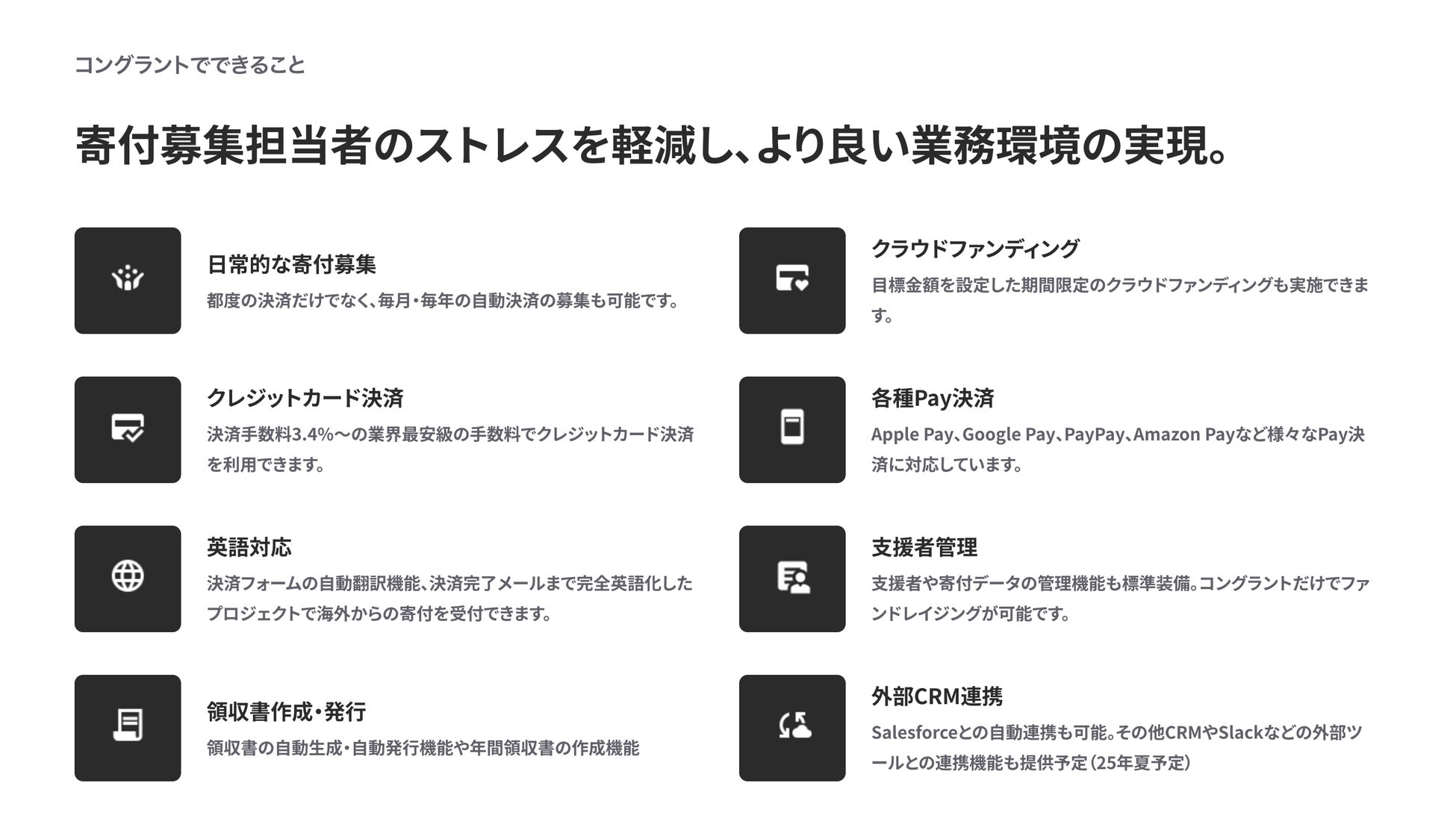 「コングラント」は、2018年にサービスを開始して以来、NPO・ソーシャルセクターの寄付募集を支えるための決済・支援者管理・領収書発行などをワンストップで提供してきました。従来の寄付決済の常識を覆すスピード感と低コストで、多くの団体の資金調達力向上と業務効率化に貢献しています。