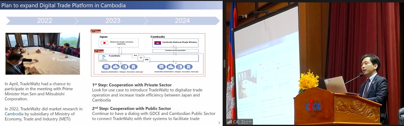 トレードワルツはパネルディスカッションで、①貿易業界が持つ課題や、1つの解決策TradeWaltzの紹介、②ASEAN各国 貿易プラットフォームとの連携実証(https://www.tradewaltz.com/news/3315/)、③カンボジア展開に向けたフン・セン首相との面談(https://www.tradewaltz.com/news/2046/)、関税総局長との対話(https://www.tradewaltz.com/news/3625/)、政府とのカンボジア市場調査の状況(https://www.tradewaltz.com/news/5127/)などについて報告を行い、今回④カンボジアを含むASEAN10カ国と日本が今後50年間デジタル貿易情報でつながる未来を提案しました。