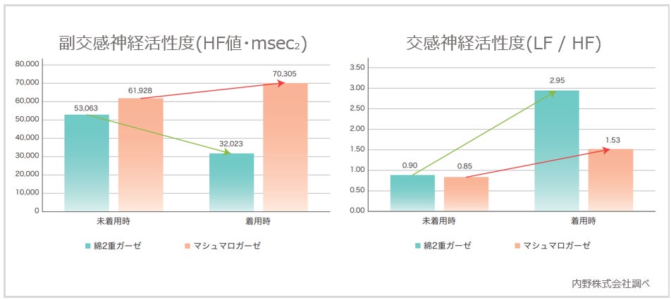 マシュマロガーゼのパジャマ着用時は、綿2重ガーゼ製品の着用時と比較して、副交感神経活性値が高く、交感神経活性値が低くなっています。マシュマロガーゼのパジャマ着用時の方が、副交感神経が優位になっていることがわかり、よりリラックスしている状態であることを示しています。