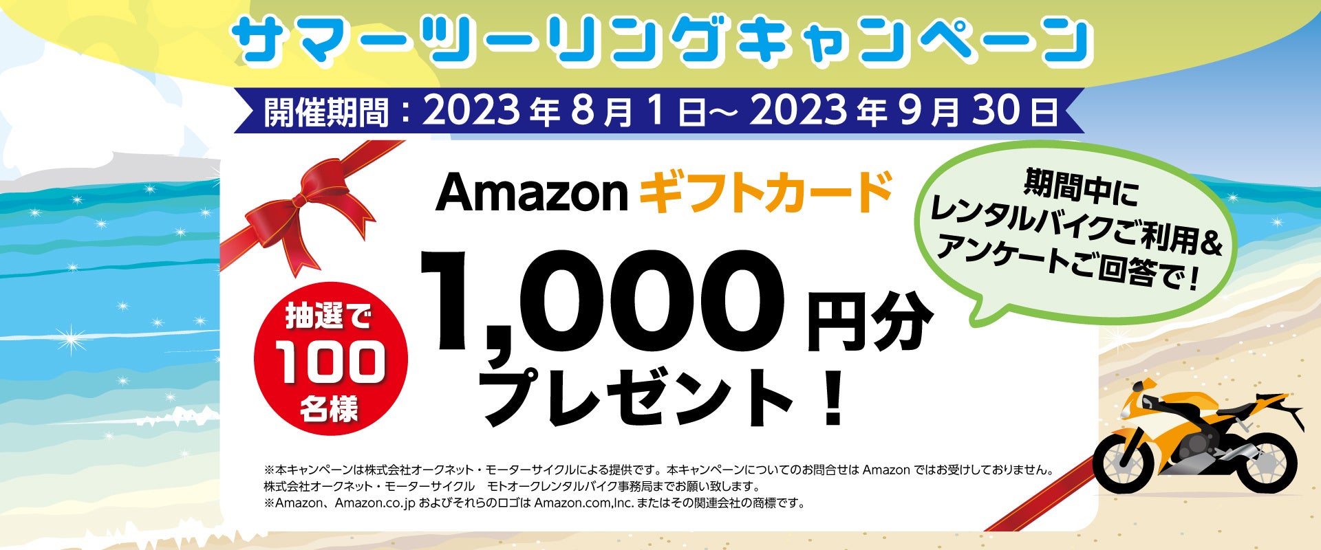 オークネット・モーターサイクル レンタルバイクサービス「モトオークレンタルバイク」抽選で100名様にAmazonギフトカード(1,000円分)が当たる「サマーツーリングキャンペーン」を実施!