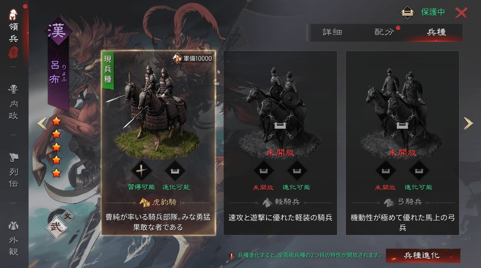 兵種にはそれぞれ長所があり相性もあるので、戦場で能力を最大限に発揮させるためには、適切に組み合わせる必要がある。たとえば、鉄の鎧を身に着け石弓と毒矢を使いこなす無当飛軍は、特定の条件下でダメージが減少するという隠れた特質がある。さらには通常攻撃のあと、ランダムで敵に動揺、恐慌などの状態異常を与えることができる。また、曹操の騎兵隊として名高い虎豹騎は、初ターンの通常攻撃で相手を混乱状態にさせることができる。