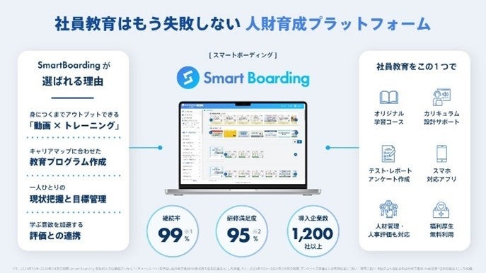 独自の教育研修コンテンツに「Smart Boarding(スマートボーディング)」の400種類以上の動画コンテンツと豊富な学習管理機能を連携しました。Smart Boardingは、教育研修・コンサルティングのプロが提供する人財育成プラットフォームです。組織成長に必要な社員教育を実現する「人材育成」、学ぶ意欲を加速させる「人材評価」、社員一人ひとりの現状把握と目標管理ができる「人材管理」の3つの機能を備えています。