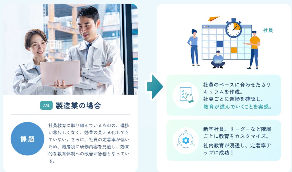そして、製造業を中心とした人手不足、人材の育成に関する需要の増加を受け、この度、人材育成研修の構築支援から動画研修コンテンツの提供と学習の管理機能を拡充し、講師研修サービスとの連携を強化することで、より多くの企業の人材育成課題に応えるサービス『マエトレ』としてリニューアルいたしました。
