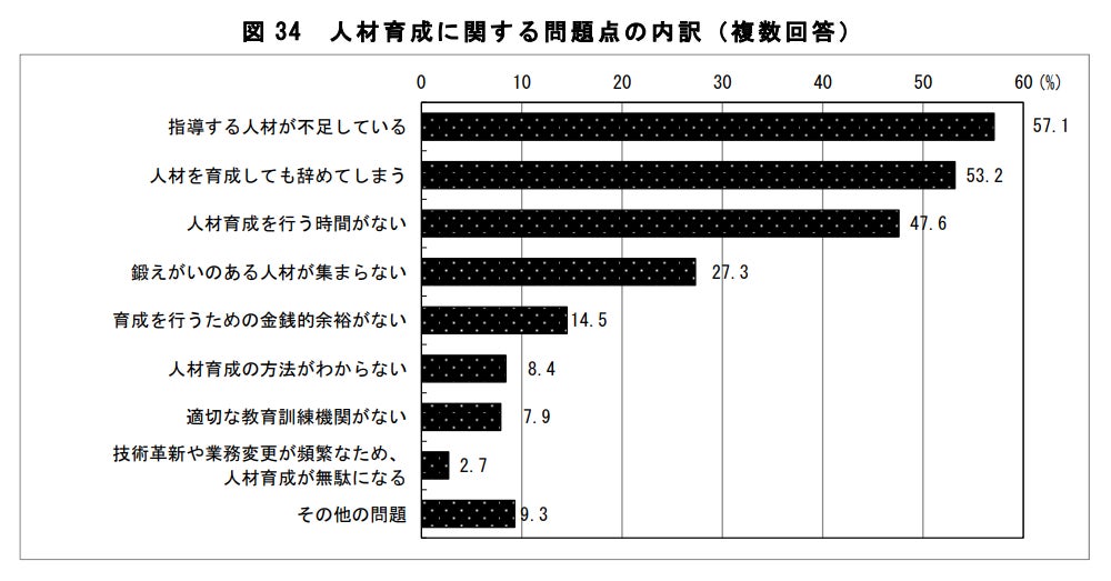 しかし、厚生労働省の調査によると、能力開発や人材育成に「何らかの問題がある」とする事業所は79.8%であり、問題点の内訳として「指導する人材の不足」が57.1%、「人材育成を行う時間の不足」は47.6%となっており、多くの企業が人材育成に課題を抱えています。※