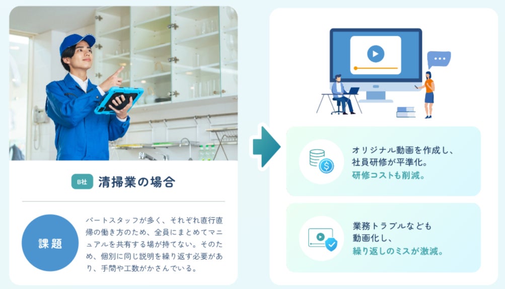就業場所が複数あり統一した研修が困難、アルバイトやパートタイムを採用するたびに研修が必要、といった課題をお持ちの企業様に特にご好評いただいています。