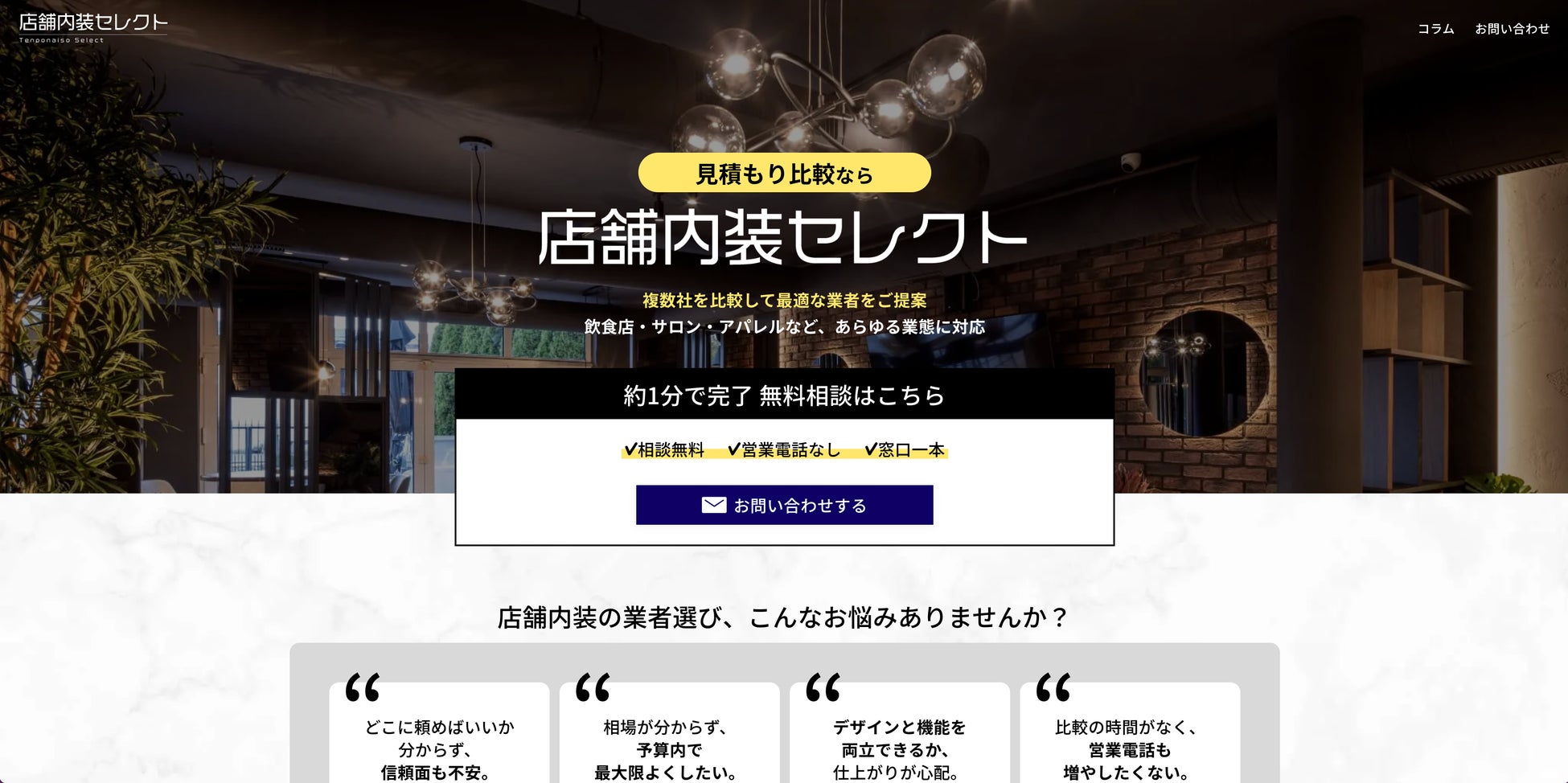 『店舗内装セレクト』は、飲食店やサロン・アパレルなどあらゆる業態に対応、店舗内装に関する最適な業者をご提案し、見積もりを比較できるサイトです。