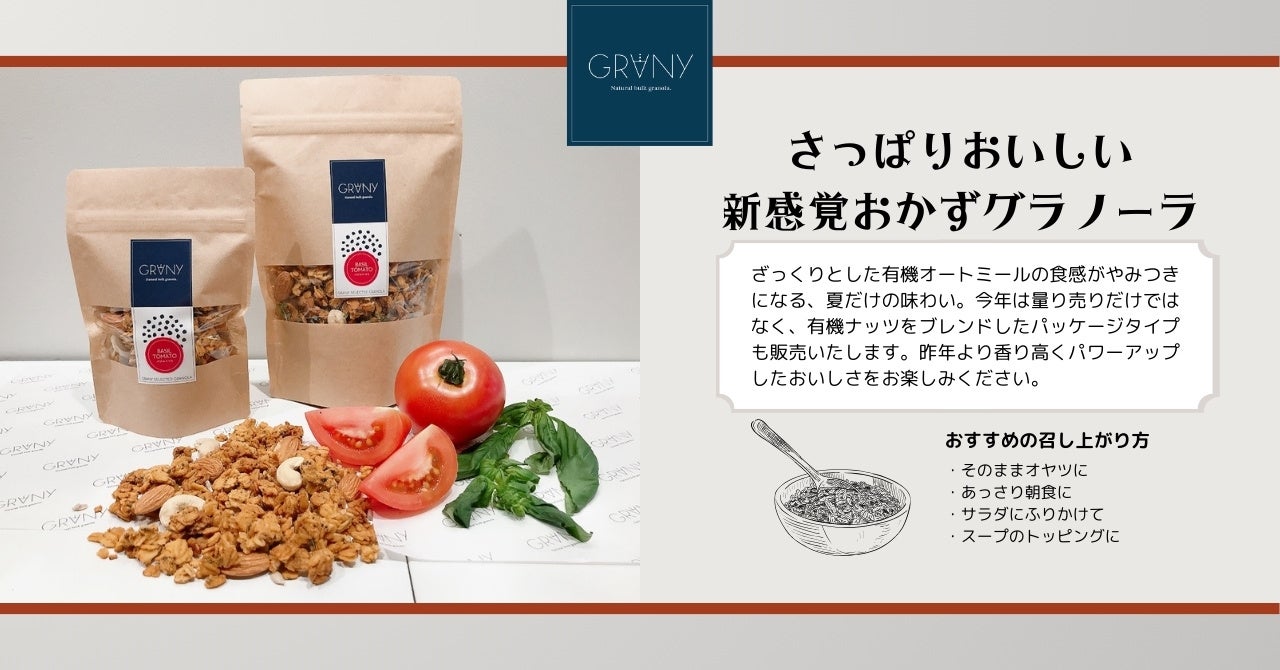 夏季限定フレーバー『バジルトマト』のグラノーラを再販いたします。今年はパッケージ(Sサイズ・Mサイズ)でも販売します。