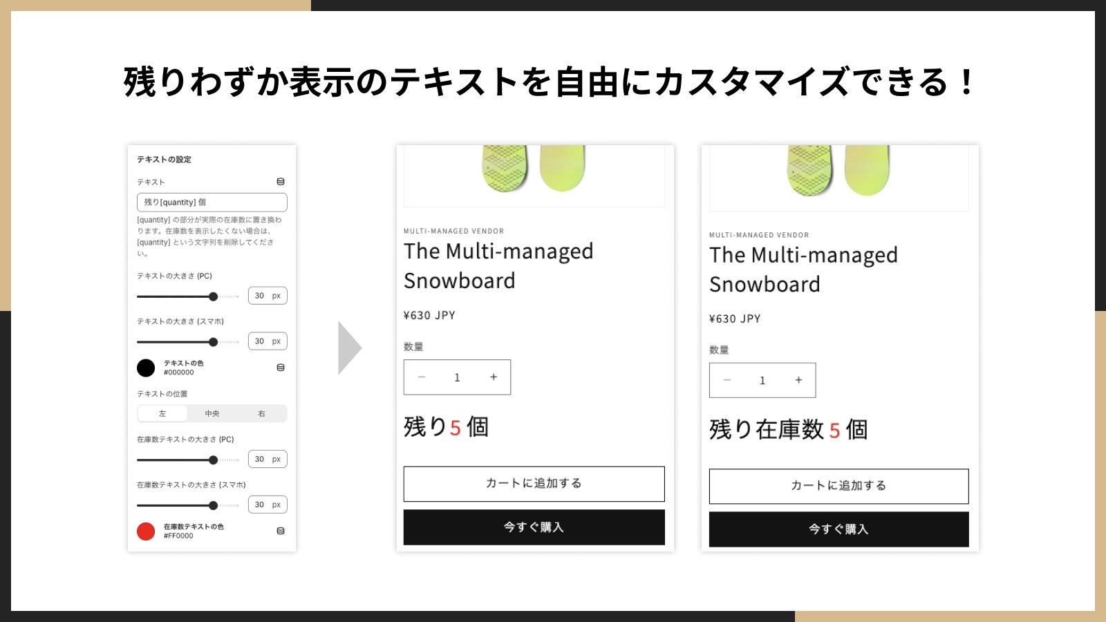 「シンプル在庫数表示|お手軽残りわずか表示」は、在庫数表示のテキストを自由にカスタマイズできます。