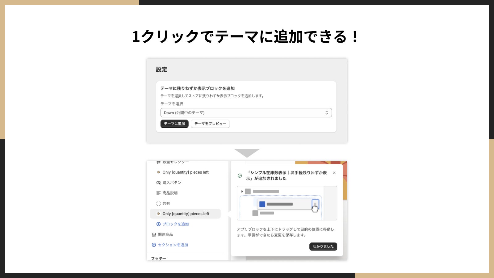 「シンプル在庫数表示|お手軽残りわずか表示」は、1クリックでテーマに追加できます。