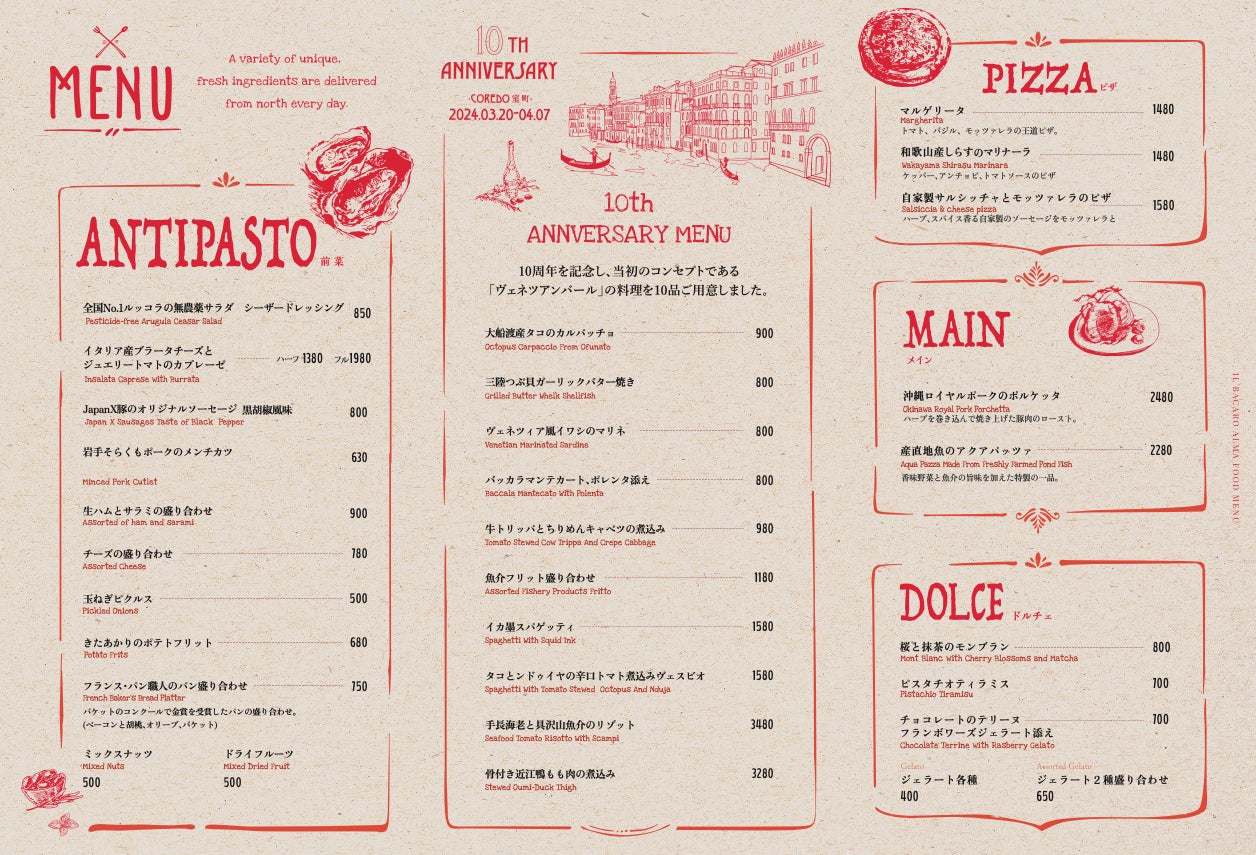「IL BACARO ALMA」は、全国各地の豊かな漁港、雄大な自然に囲まれた農園で育った食の恵みを仕入れ、食の恵みがたっぷりと詰まった伝統的なイタリア郷土料理を提供するイタリアンバールで、おかげさまで2024年に10周年を迎えることとなりました。この度オープン10周年を記念して、ヴェネツィアフェアを開催いたします。