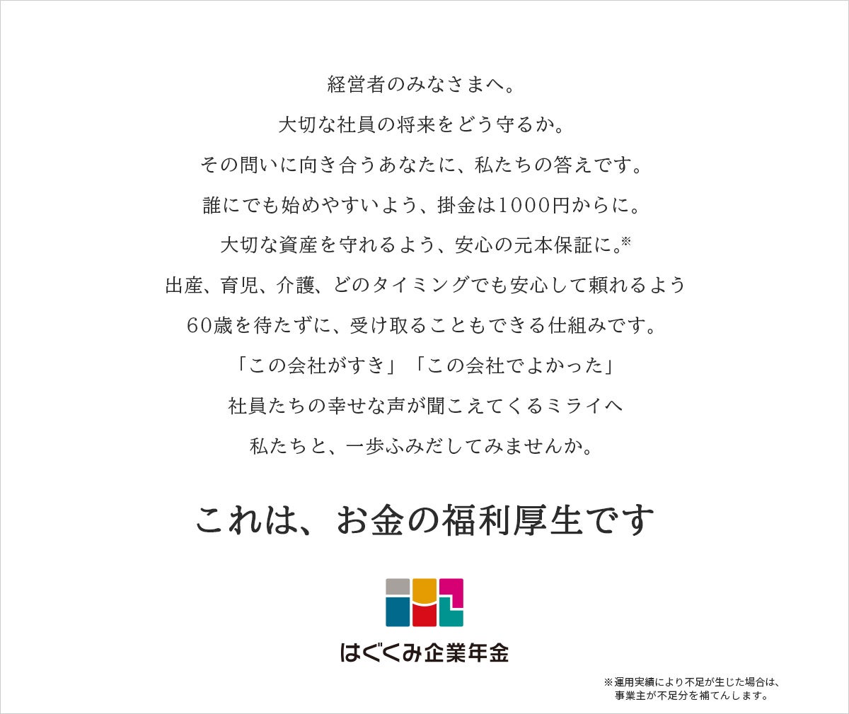 今後も、より多くの方々に「はぐくみ企業年金」を知っていただき、社会を支えてくださるすべての方々に経済的な幸せをお届けできるよう、全力で取り組んでまいります。