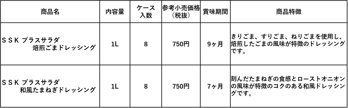 エスエスケイフーズ株式会社(本社:静岡市葵区)は、「SSKドレッシング プラスサラダ」に新たに1Lの商品を2品追加し、発売致します。
