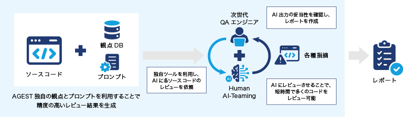 本サービスでは、AIにソースコードを一次レビューさせる際に、当社がこれまでの支援実績を通じて培ってきた当社独自のレビュー観点と、AI技術の研究や検証を行うAGEST AI Lab.のナレッジを活用したプロンプトやツールを利用することで、精度の高いレビュー結果を効率よく生成いたします。AIが生成した問題点や修正コード案に対し、次世代QAエンジニアがその妥当性の確認や修正を行うことで、従来より短時間で質の高いコードレビューを実施することが可能になります。また、納品するレポートでは、問題点の指摘にとどまらず、ベストプラクティスや対象コードにあわせたより具体的な修正案の提案を行うなど、効率的にコード品質を改善したいお客様に適したサービスとなっています。