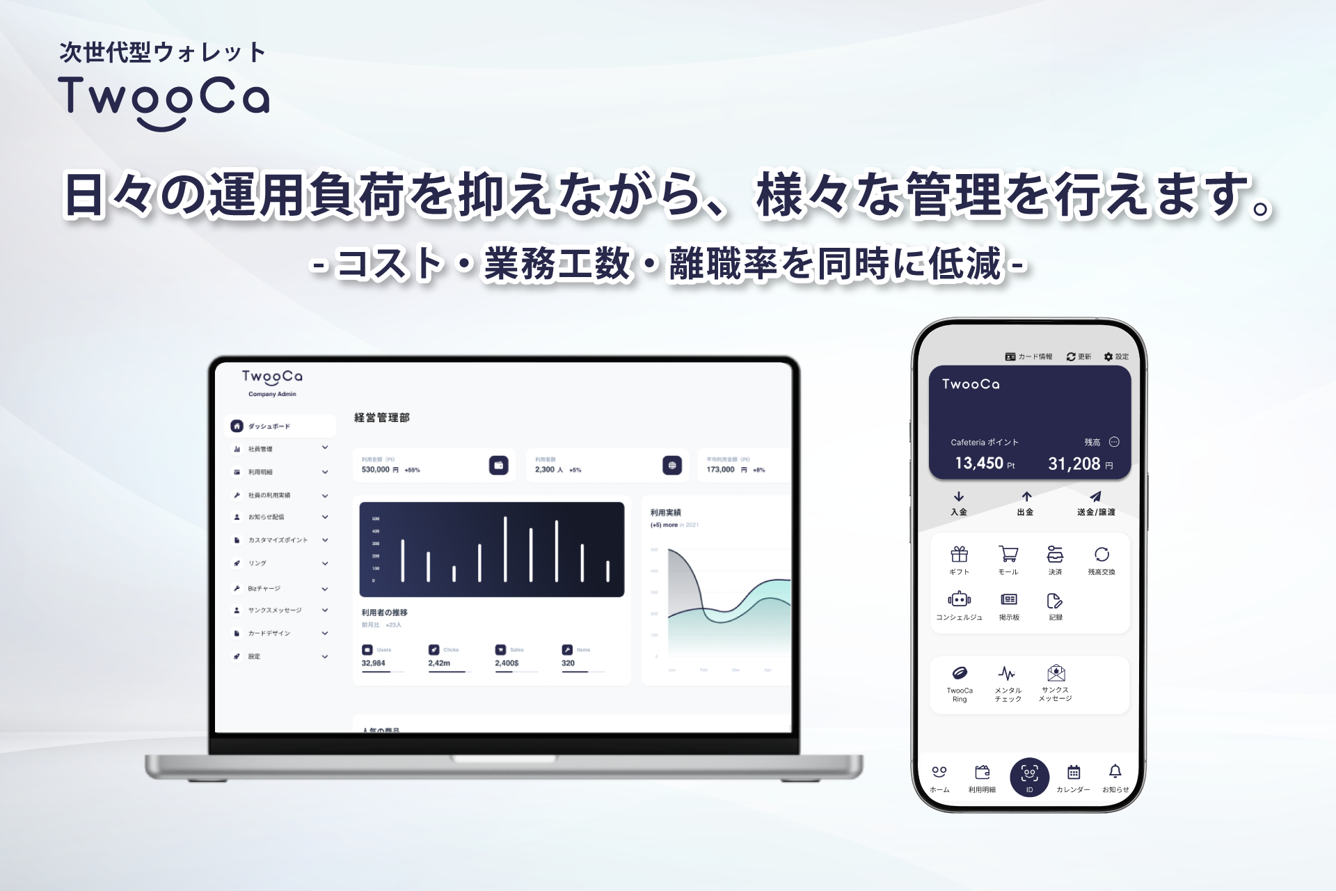 TwooCaとは、当社が提供する各種サービスの総称であり、主なサービスは、国際ブランドカードの決済機能付き従業員証・会員証を備えたTwooCaアプリを通じて提供されます。アプリと連動する決済機能付きカードはプリペイド式のため、すべての従業員や会員の方にご利用いただけます(※日本国内居住者に限ります)。また、経費振込や従業員・会員間送金なども行うことができます。