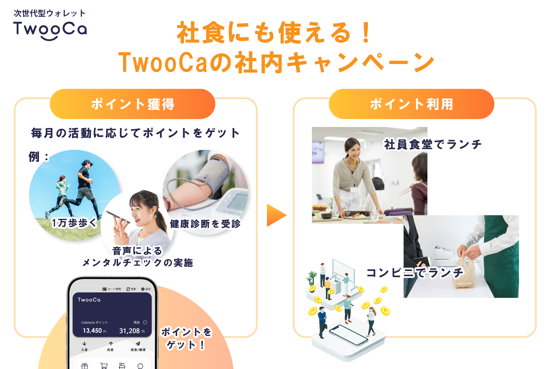 さらに、TwooCaのポイント付与の仕組みを活用した社内キャンペーンと組み合わせることで、従業員の行動に応じて付与されたポイントを社内での決済に活用することが可能となります。