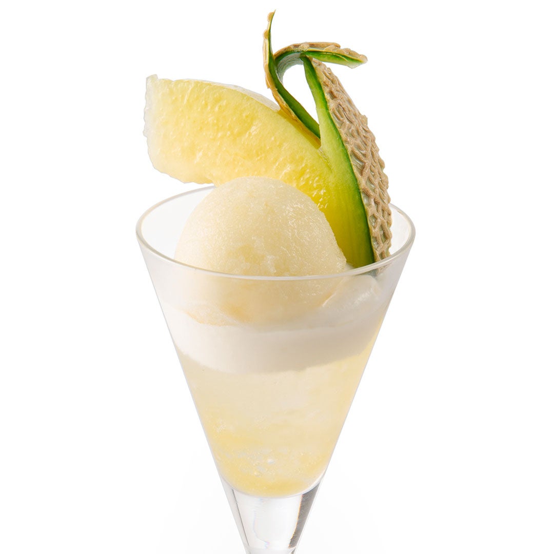 メロンの芳醇さを感じる店内製造のシャーベットと、メロンソース、コアントローゼリー、ディプロマットクリームを重ねたパフェです。