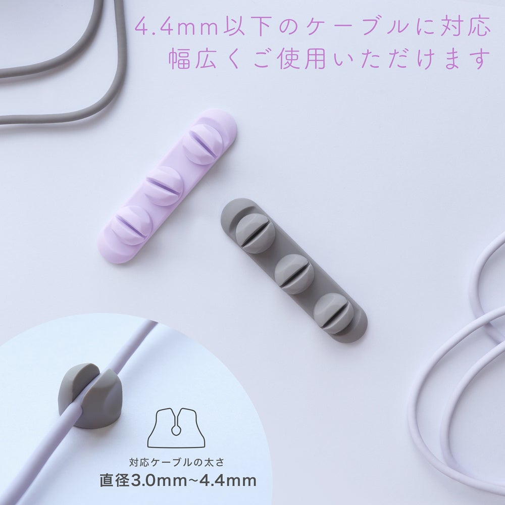 直径3.0mm ~ 4.4mmまでに対応してるので、ライトニングケーブルやUSB-Cケーブルなど様々なケーブル整理にピッタリです。