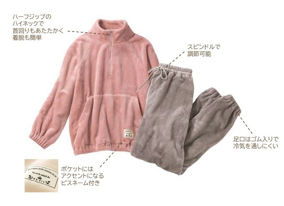 肌触りの良さだけではなく、随所に着る人のことを考えた工夫がいっぱい。スマホも入る大きなフロントポケットや、家事をしやすく・冷気は通しにくくするために袖口にはゴムを使用。そしてファスナーが肌に当たらないようファスナーカバー仕様。さらにパンツは2本通しのウエストゴムにより、肌当たり優しくフィット。