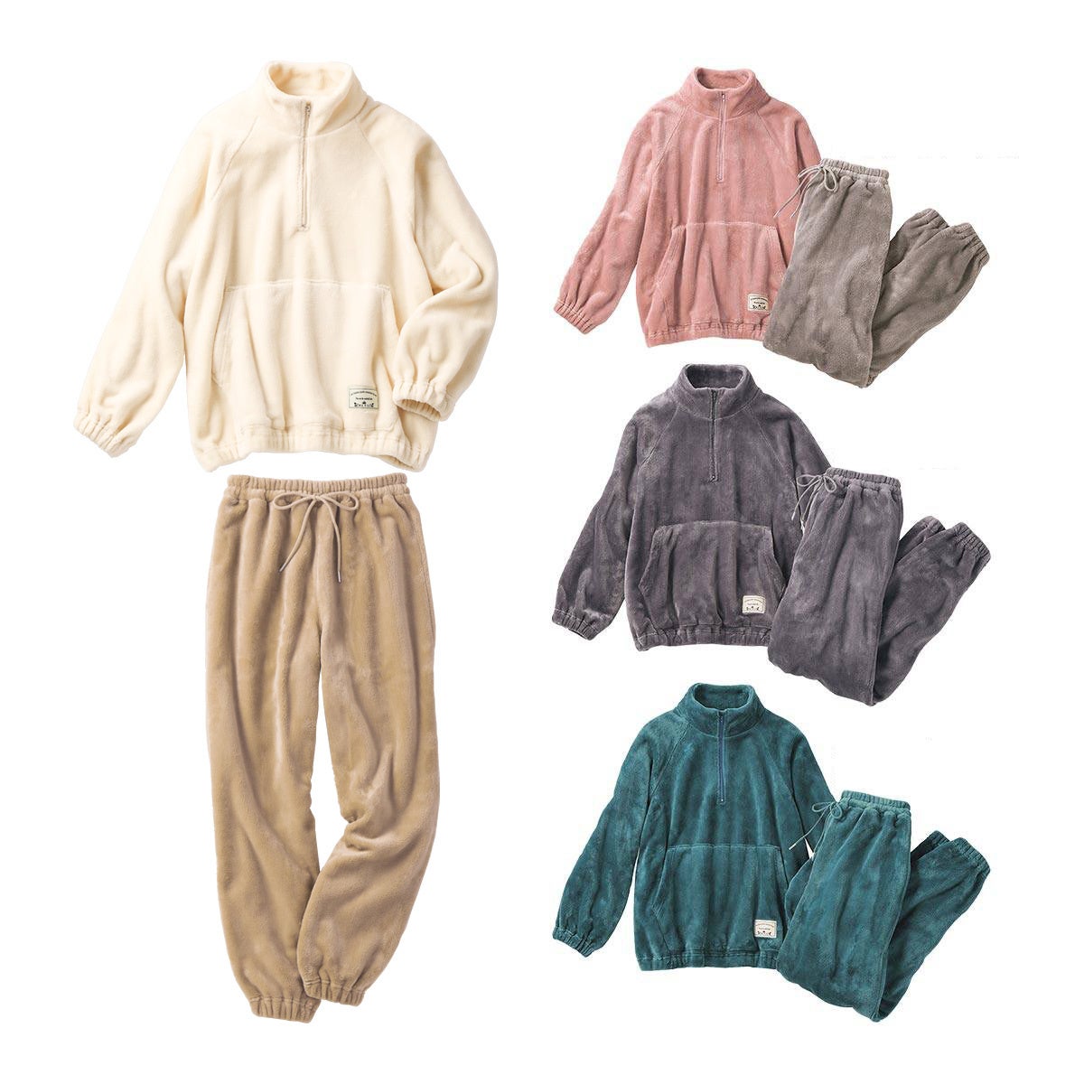 もふもふ、ふわふわ~な密度の高い両面起毛フリース素材で、毛並みが細かく手触りがとってもなめらか!クリームみたいな感触のルームウェアで、冬の節電を楽しく、心地よく行いませんか?ボリュームがあるのに洗濯後も乾きやすく、底冷えする冬には欠かせない商品です。スウェット風のこなれデザインで、首元から足首までやさしいぬくもりで包み込んでくれます。