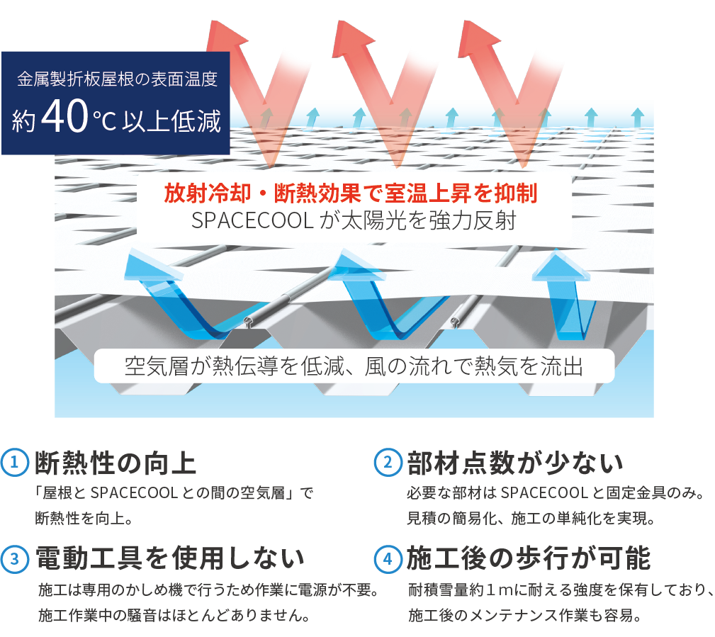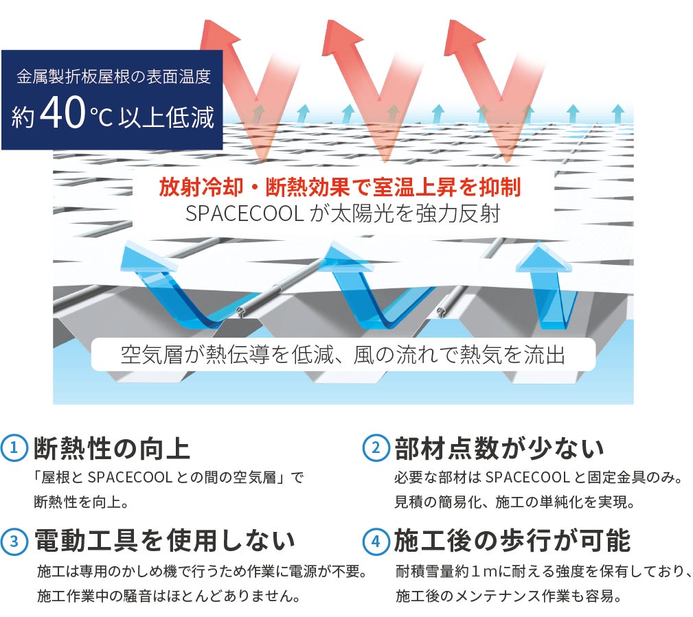 この度、その成果として日本ワイドクロス株式会社と進めていた、SPACECOOLを折板屋根に施工する「ルーフシェード(ハゼ式・重ね式)」の開発・実証を完了したことで上市に至りました。