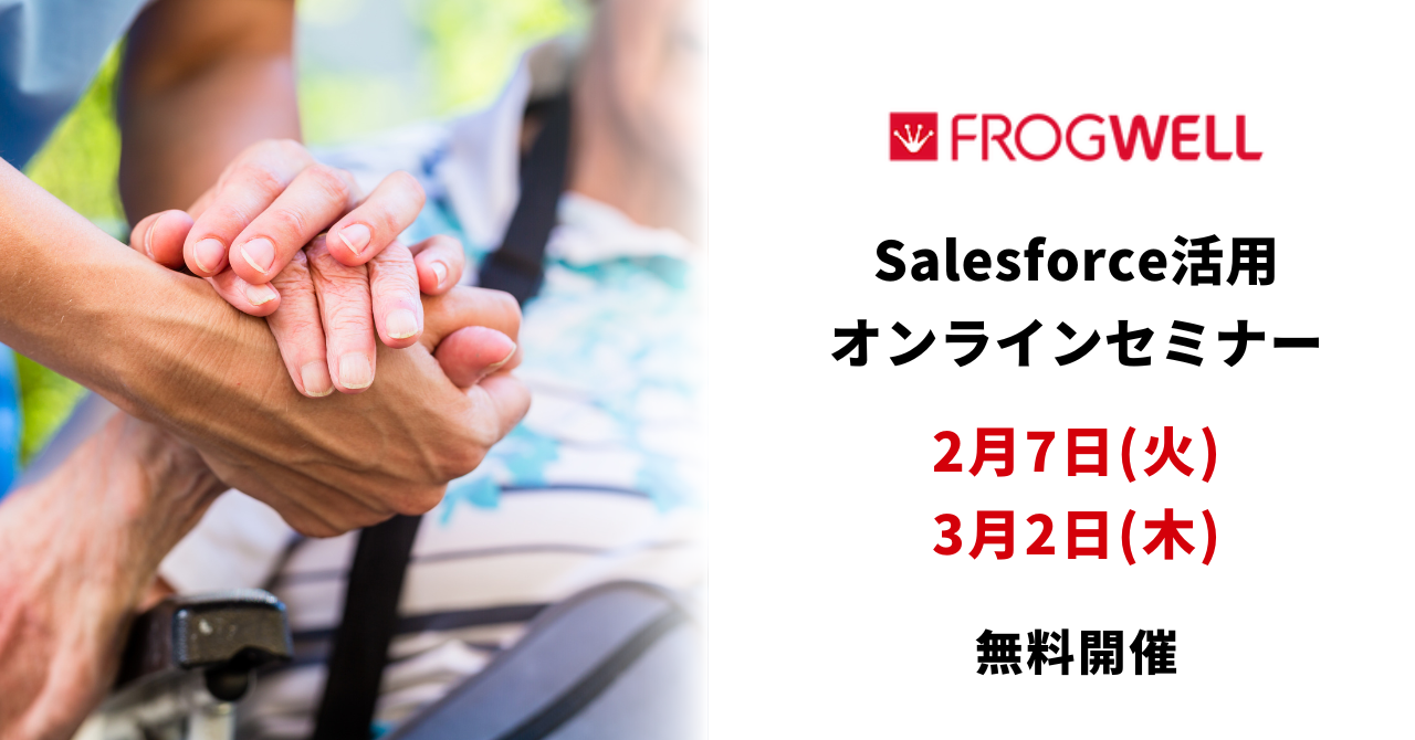 データ・プロセスのコンサルティング及びアウトソーシングサービスを提供しているフロッグウェル株式会社(所在地 : 東京都港区、 代表 : 大田宏之、以下「フロッグウェル」)は、社会福祉業界向け、Salesforce活用オンラインセミナー「【介護経営者向け】介護事業へのSalesforce導入実績多数!コロナ対策から始める利用者360°ビューのビジョン!」を2月7日(火)・3月2日(木)に無料開催いたします。