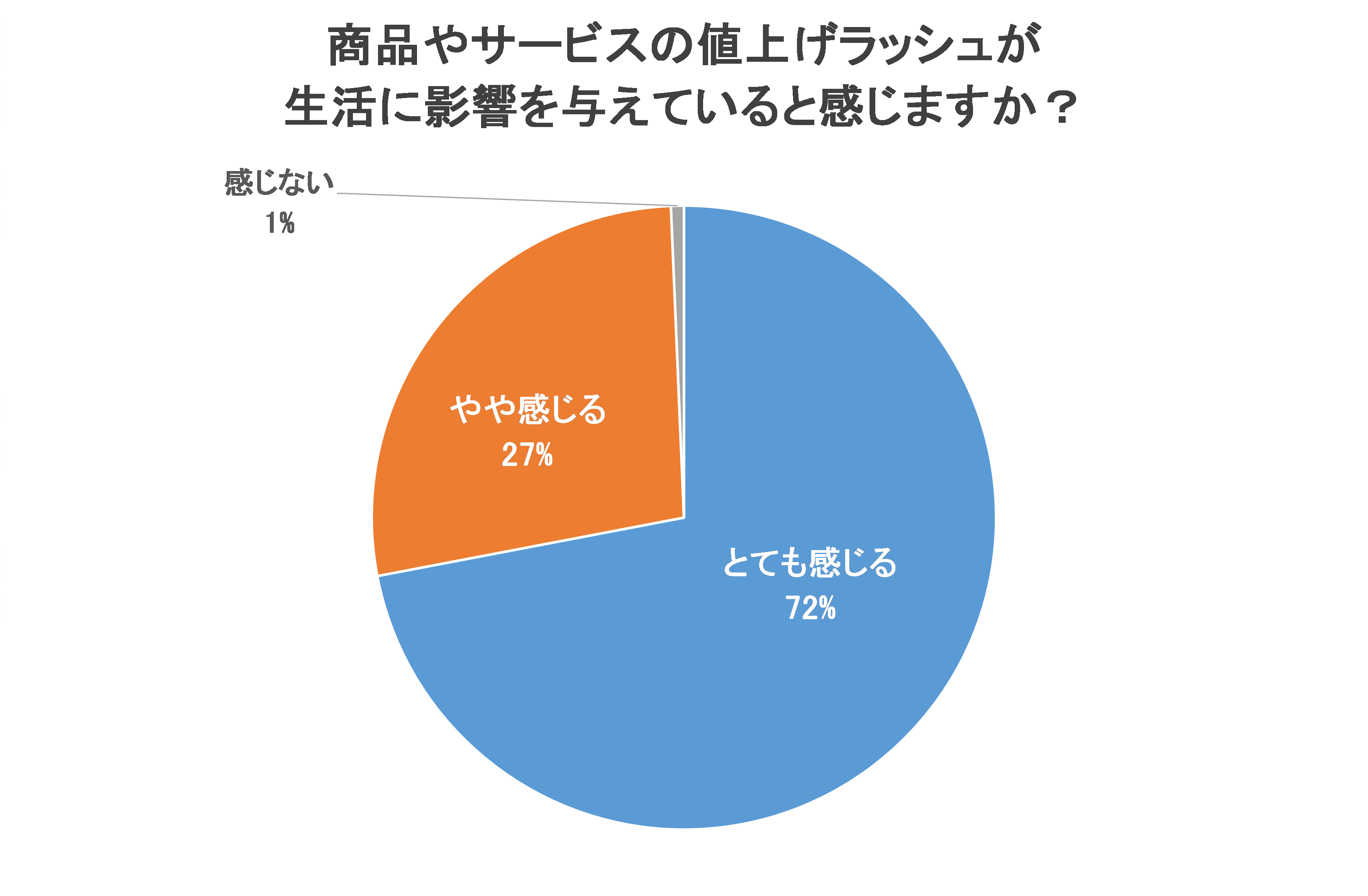 「商品やサービスの値上げラッシュが生活に影響を与えていると感じますか?」という質問では、「とても感じる」が72%、「やや感じる」が27%で、値上げラッシュの生活への影響を感じる人が99%を占める結果になりました。
