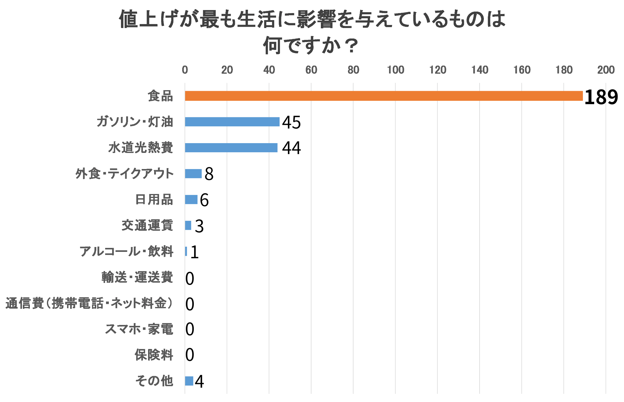 「値上げが最も生活に影響を与えているものは何ですか?」という質問では、「食品」が189票(62%)を集め、「ガソリン・灯油」45票(15%)、「水道光熱費」44票(15%)が続く結果になりました。