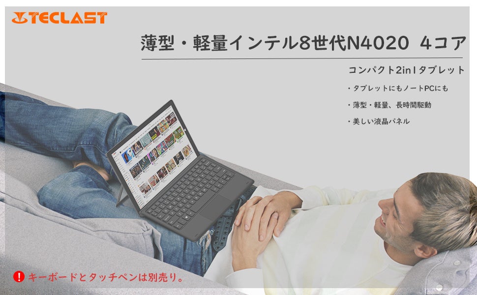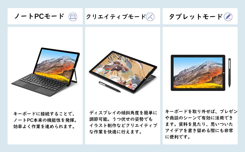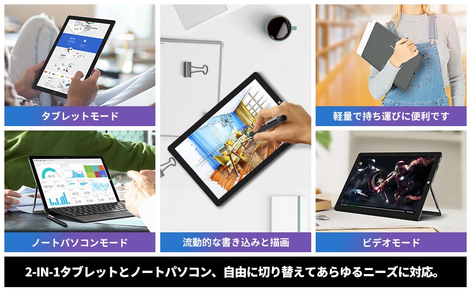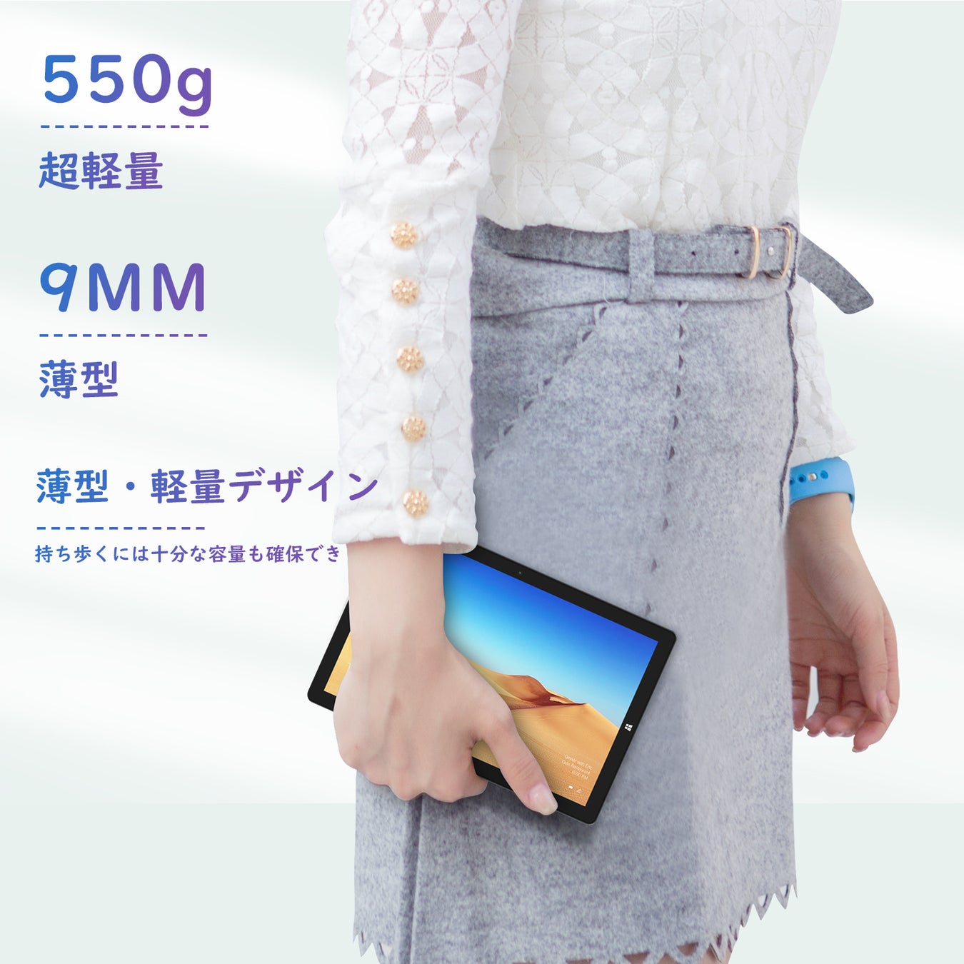 わずか55g、厚さ9MMの2in1 超軽量ノートパソコン / タブレット。持ち運びに便利なコンパクトボディーにキーボード体型の専用がバーを販売し、カバーを装着することでノートパソコのようには画面を閉じて持ち運ぶことがてき、移動時の画面への衝撃を緩和します。